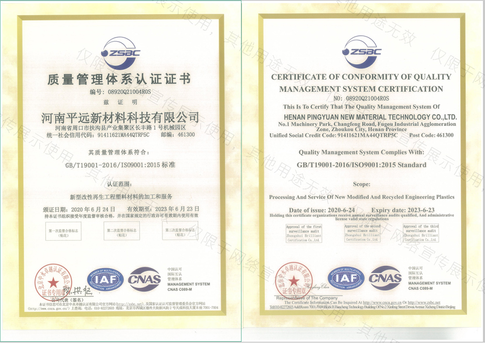 河南平遠(yuǎn)新材料科技有限公司生產(chǎn)基地坐落于河南省鄢陵縣先進(jìn)制造業(yè)開發(fā)區(qū),工廠占地10000平方米。公司通過GRS全球回收標(biāo)準(zhǔn)認(rèn)證、ISO9001質(zhì)量體系、14001環(huán)境體系和45001職業(yè)健康安全管理體認(rèn)證。華東分公司位于浙江省余姚市中國塑料城。